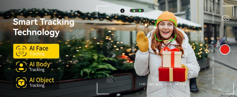 Let AI do the tracking — face, body, or objects — so you can move freely and never miss a moment.